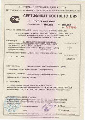 Сертификат лампы внутреннего освещения Philips